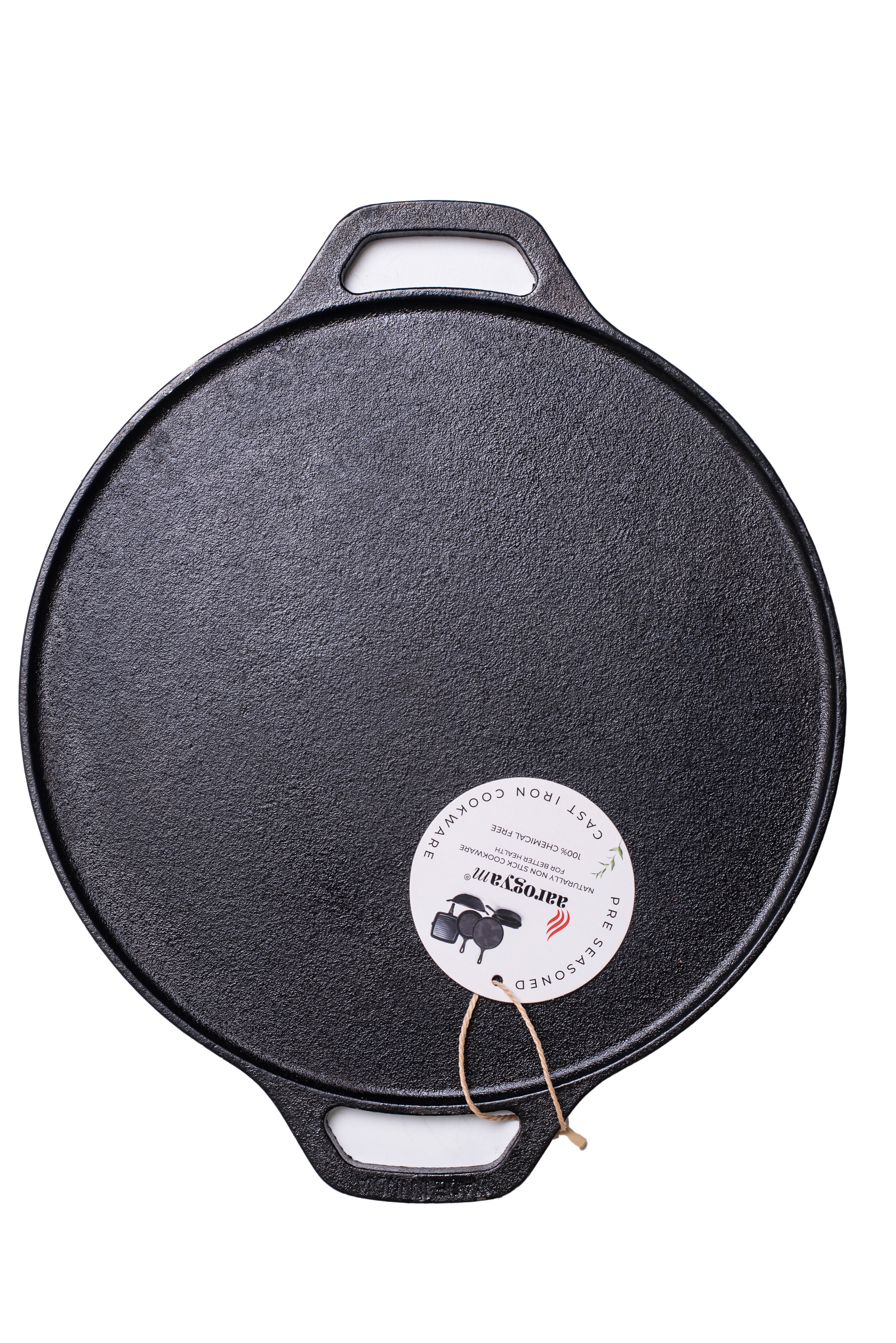 Aarogyam Cast iron 100% pre-seasoned tawa is ideal for preparing delicious crispy dosa, set dosa, chapati, phulka and paratha. The tawa is also suitable for use on Induction cook tops Naturally Non-Stick. No toxic coatings. Heavy duty cast iron for optimal heat retention and even heating. Its easy to use! 100% Pre Seasoned 100% Pre Seasoned